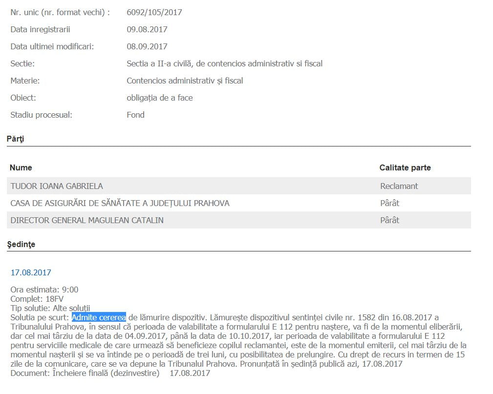 Solutia pe scurt: Admite cererea de lămurire dispozitiv. Lămureşte dispozitivul sentinţei civile nr. 1582 din 16.08.2017 a Tribunalului Prahova, în sensul că perioada de valabilitate a formularului E 112 pentru naştere, va fi de la momentul eliberării, dar cel mai târziu de la data de 04.09.2017, până la data de 10.10.2017, iar perioada de valabilitate a formularului E 112 pentru serviciile medicale de care urmează să beneficieze copilul reclamantei, este de la momentul emiterii, cel mai târziu de la momentul naşterii şi se va întinde pe o perioadă de trei luni, cu posibilitatea de prelungire. Cu drept de recurs in termen de 15 zile de la comunicare, care se va depune la Tribunalul Prahova. Pronunţată în şedinţă publică azi, 17.08.2017