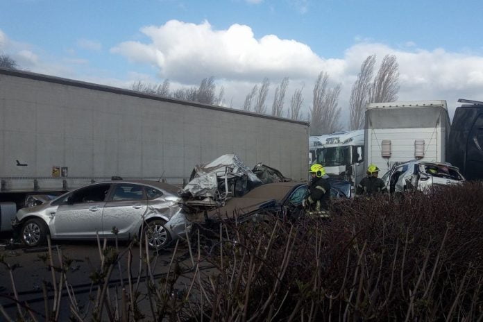 Mai multe mașini și un camion s-au ciocnit pe tronsonul de kilometru 26 al autostrăzii M1. Camionul a alunecat pe banda din sens opus, astfel încât autostrada a fost închisă în ambele sensuri. Mai multe persoane au fost rănite în accident, iar mai multe mașini au luat foc.