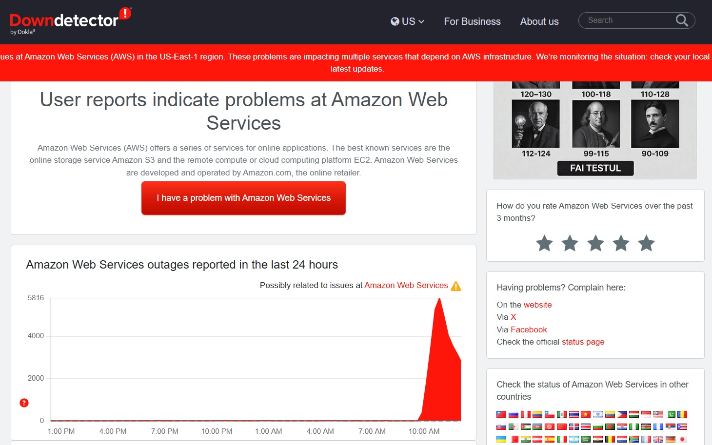 Compania a înregistrat „rate de eroare crescute” și întârzieri cu „mai multe servicii AWS”, a precizat compania pe pagina sa de stare a serviciilor.