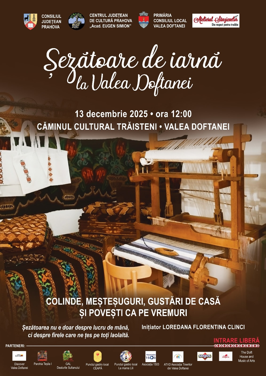 Astfel, sâmbătă, 13 decembrie, toți cei care vor să participe la șezătoare, sunt așteptați la Valea Doftanei. Și chiar dacă nu ajung atunci, cei care doresc pot vizita Atelierul Sânzienelor, în satul Teșila, atunci când au drum prin Valea Doftanei. E la stradă, nu aveți cum să-l ratați și chiar merită vizitat.