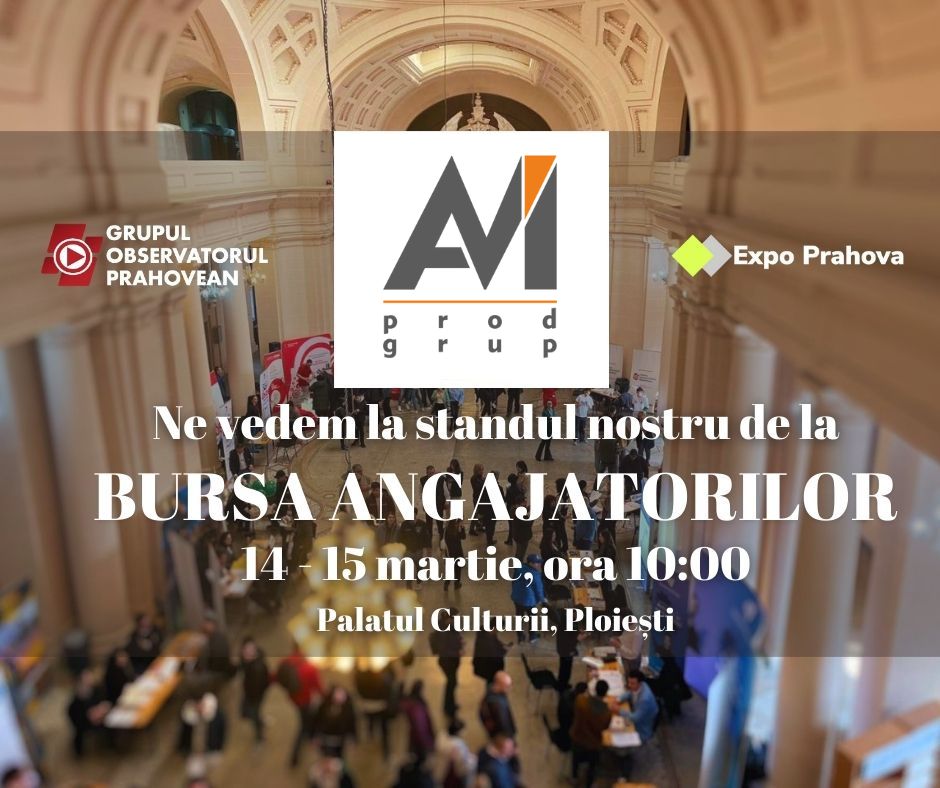 Oferta completă a posturilor disponibile în cadrul companiei Avi Prod Grup poate fi studiată în detaliu, la ediția a patra a târgului de joburi Bursa Angajatorilor, vizitând standul firmei pe 14 și 15 martie, în Sala Coloanelor din Palatul Culturii Ploiești.