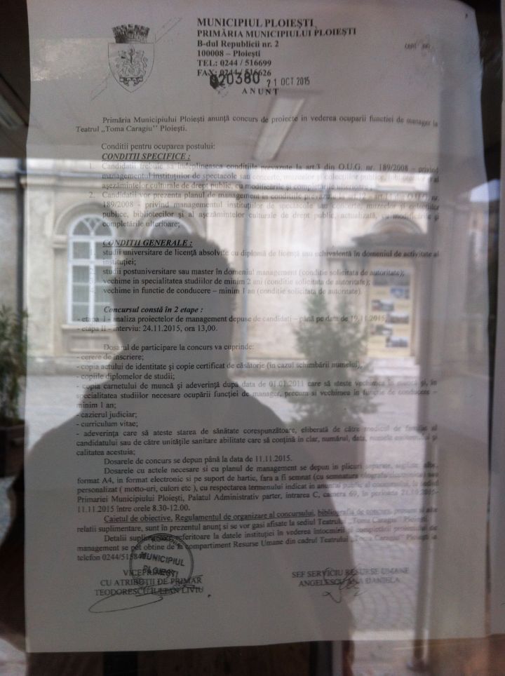 Teatrul ploiștean Toma Caragiu își caută manager. Anunțul de angajare a fost făcut public printr-un afiș pe ușa instituției încă din data de 21 octombrie, iar potrivit aceluiași anunț, data limita de înscriere la concurs este de 19 noiembrie.