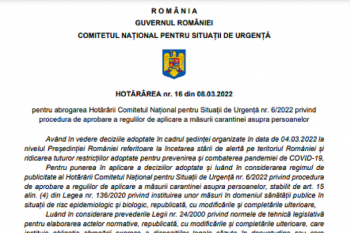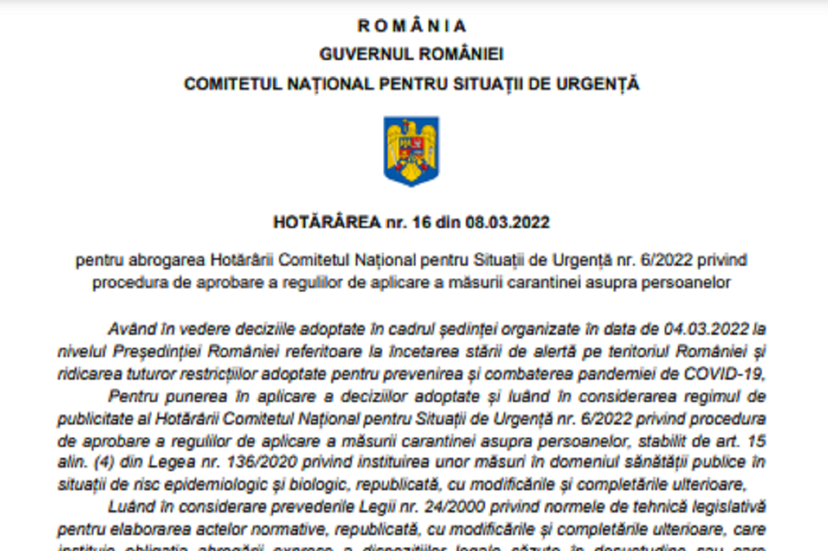 Începând din 9 martie, România nu va mai impune carantina cetățenilor veniți din alte țări. La intrarea în țară nu va mai fi nevoie de certificatul covid, test PCR sau formularul PLF.