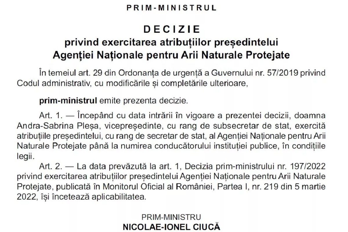 Premierul Nicolae Ciucă a semnat luni o decizie prin care Andra Sabrina Pleșa va prelua atribuțiile de președinte al Agenţiei Naţionale pentru Arii Naturale Protejate până la numirea unui conducător la această instituție.
