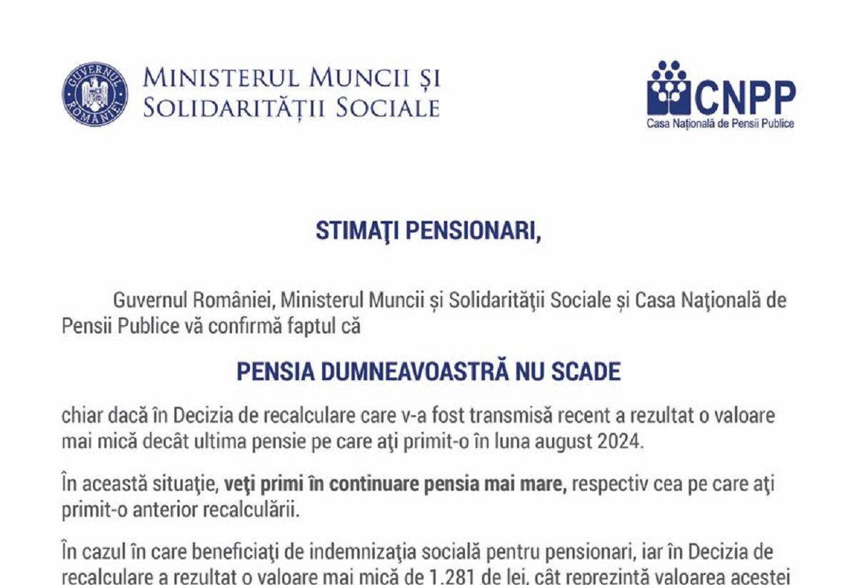 Ministerul Muncii a publicat scrisoarea oficială pe care o vor primi toți pensionarii, la cererea premierului Marcel Ciolacu, prin care seniorii vor fi informați că pensia lor în plată nu scade. Aceasta, după ce mii de oameni au primit decizii de recalculare cu sume mai mici decât ceea ce primesc acum.