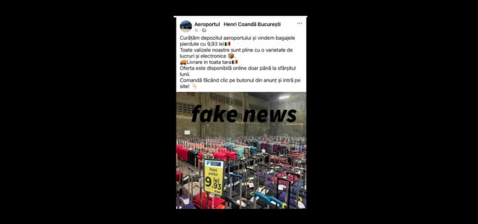 De câteva zile, în mediul on line circulă un fake news legat de cele două aeroporturi din Capitală. Mai precis, pe o pagină falsă de facebook,  bagajele pierdute de călători pe  Aeroporturile Otopeni și Băneasa, ar fi vândute cu suma de 9,93 lei.