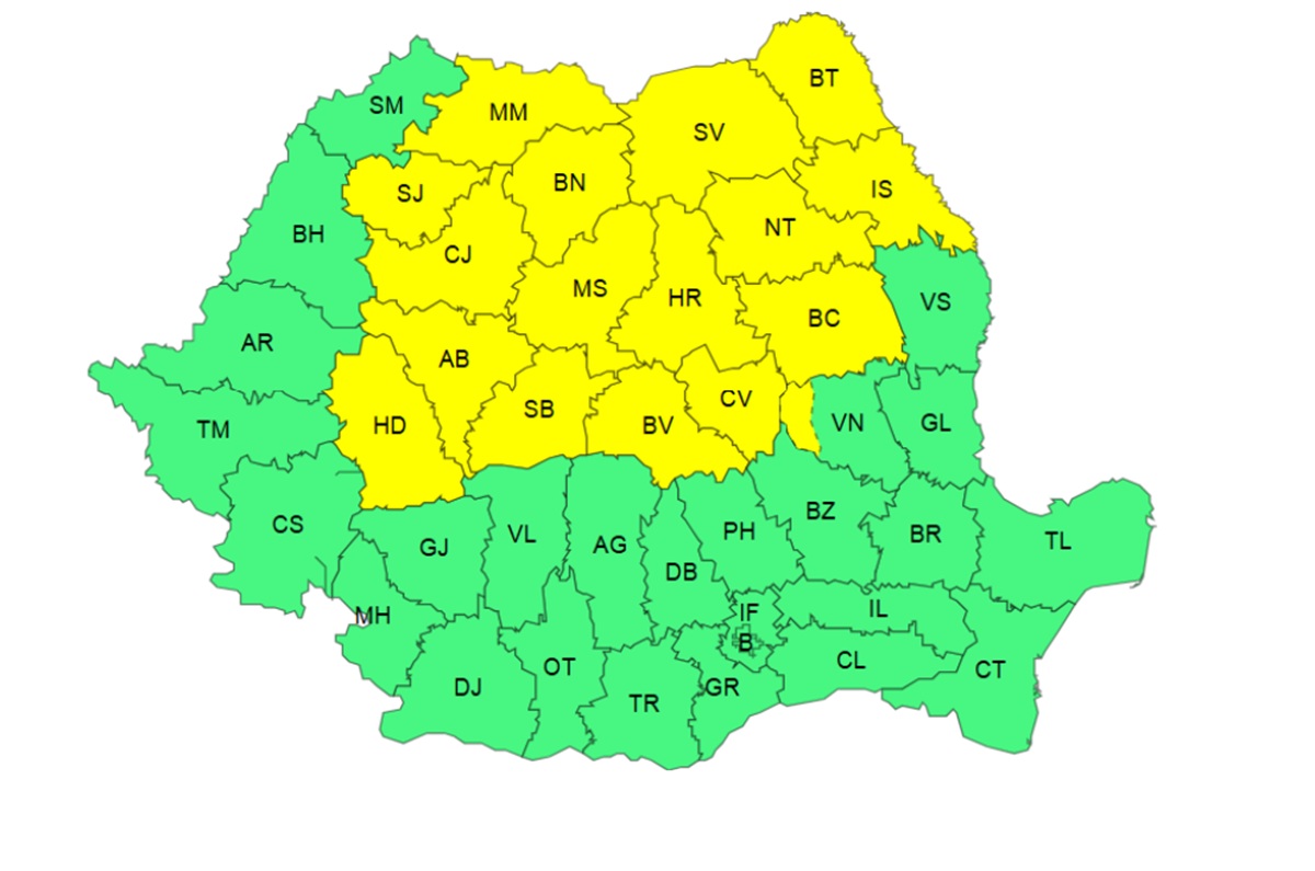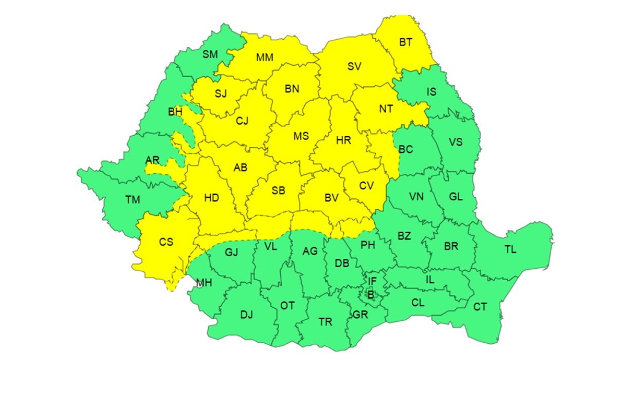 În acelaşi interval este valabilă o avertizare cod galben, fiind anunţate val de căldură, temperaturi deosebit de ridicate, caniculă şi disconfort termic ridicat, în Maramureş, nordul Crişanei, sudul Banatului, cea mai mare parte a Transilvaniei, vestul şi sudul Olteniei, sud-vestul şi centrul Munteniei. Temperaturile maxime vor fi cuprinse între 33 și 37 de grade, cu cele mai ridicate valori în sud-vestul țării.