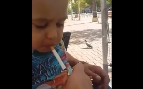 Ce este si mai ingrozitor este ca unul dintre cei doi barbati este chiar tatal acestuia, care il incurajeaza pe cel mic sa fumeze si sa consume alcool. Cel care a publicat imaginile pe Facebook, un roman din Madrid, face apel la viralizarea clipului pentru a putea fi identificat tatal iresponsabil.