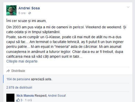 Din 2003 am pus viața a mii de oameni in pericol. Weekend de weekend. Și cate-odata și in timpul săptamânii. (…) Am terminat o facultate tehnică, aș fi putut fi un bun inginer pentru patrie… M-am eșuat in "meseria" asta de cârcimar. Mi-am asumat cunoașterea in amănunt a tuturor legilor. Chiar daca eu ar fi trebuit, dupa calificarea mea să văd câți amperi sunt in tabloul de siguranțe și dacă poate să ia foc vreun cablu. Nici măcar asta n-am facut suficient de bine. Am avut destule "avarii: electrice in aștia 14 ani. Și mult improvizatii… Cred că alături de Fire si Club A suntem cei mai vechi care încă mai funcționăm in București. Sunt prieten cu unul din patronii de la Colectiv. Știu ca o sa facă mulți ani de pușcarie. Ar fi trebuit să mă ia și pe mine”, își începe Andrei Sosa postarea pe Facebook.