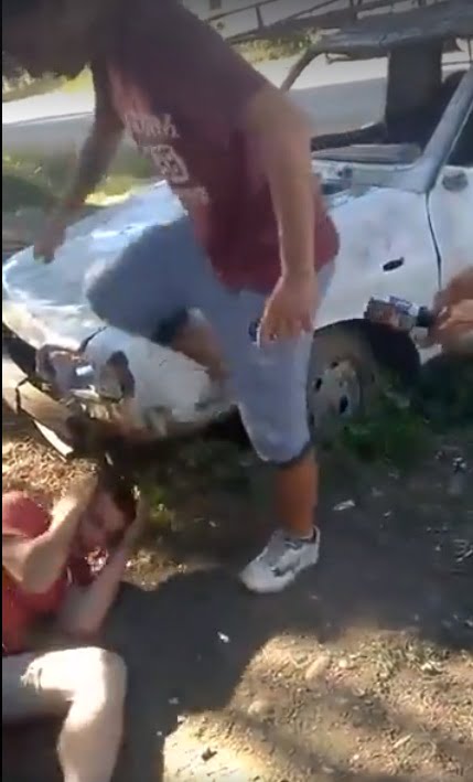 Cei doi agresori nu se opresc decât după ce victima lor, aflată la pământ, începe să sângereze în zona capului.