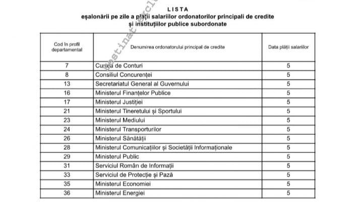 Conform Ordinului ministrului Finanţelor 35 de instituţii ale statului vor plăti în data de 5 aprilie salariile aferente lunii martie 2018.
