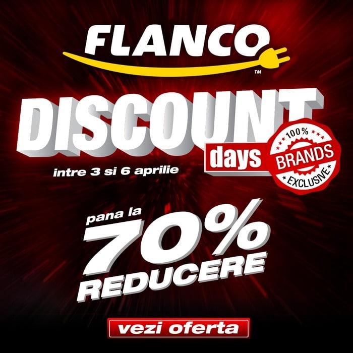 Paştele se apropie iar marii retaileri online scot la vânzare sute de produse încadrate în oferte care nu pot fi refuzate. Este şi cazul Flanco, unde timp de patru zile poţi cumpăra de la televizoare smart până la maşini de spălat cu preţuri reduse de până la 70%. Întreaga oferta o poţi consulta , iar noi am făcut pentru o scurtă listă cu merită să cumperi. Campania se desfășoară DOAR on-line.