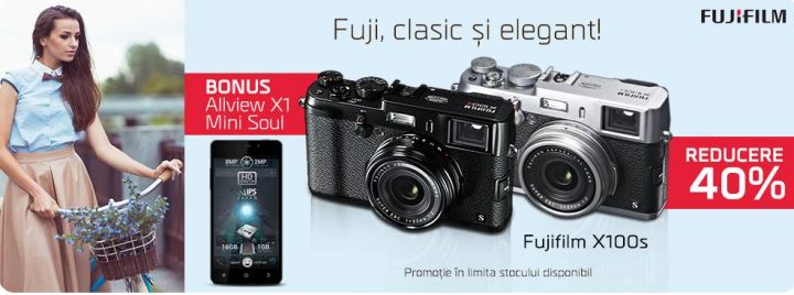 F64 anunţă promoţia care ne-a aprins imaginaţia „Reducere de 40% şi un telefon Smartphone Allview X1 la achiziţionarea unui Fujifilm X100S”.