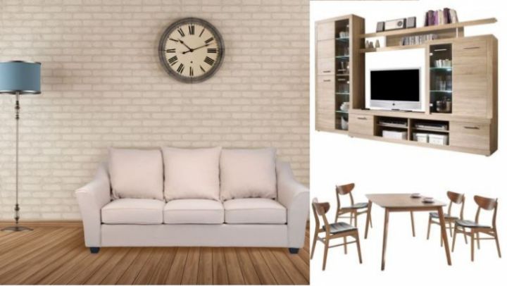 Mobilierul de living din imagine vine cu o reducere de 28% în această perioadă şi este disponibil în culoarea stejar. Mobilierul este realizat din plăci aglomerate din lemn.