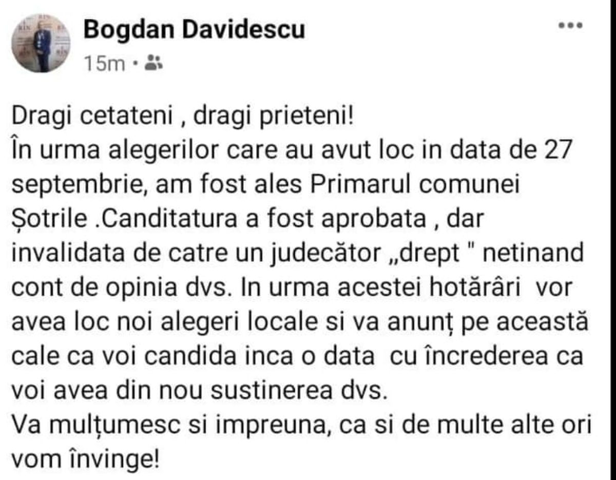 Mesajul transmis de fostul primar pe Facebook: