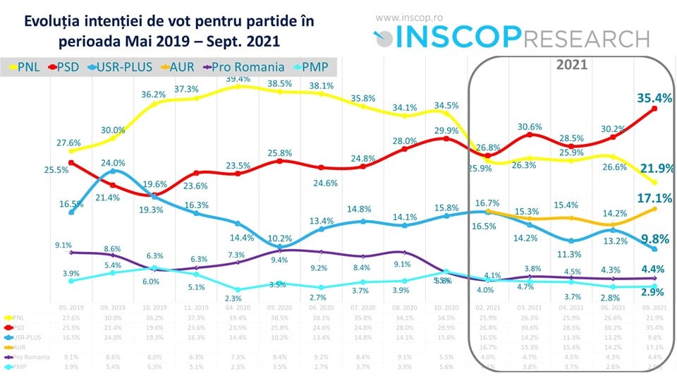 În același timp, atât PNL cât și USR par a deconta criza politică actuală dar și lunile la guvernare, ambele partide înregistrând pierderi importante în ceea ce privește intenția de vot.