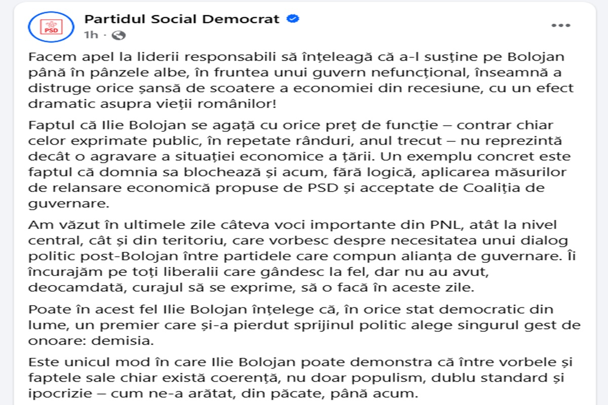 În finalul apelului, social-democrații transmit că, într-un stat democratic, un premier care și-a pierdut sprijinul politic ar trebui să își dea demisia. „Este unicul mod în care Ilie Bolojan poate demonstra că între vorbele și faptele sale există coerență”, se mai arată în mesajul PSD.