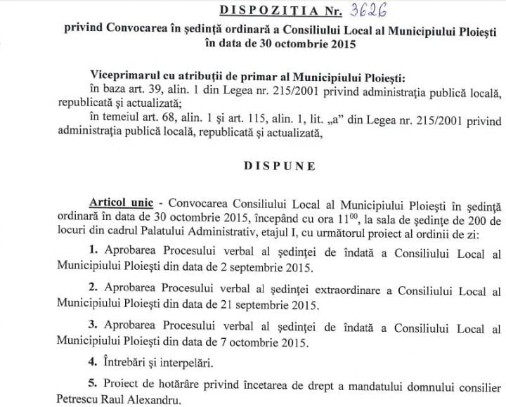 Liderii UNPR se pare că au decis să tranșeze problema legată de Raul Petrescu, după ce acesta ar fi avut la dispoziție o săptămână să-și dea demisia din Consiliul Local Ploiești. Cum acesta nu a făcut acest gest, considerat de unii de onoare, aseară liderii UNPR au decis suspendarea lui Raul Petrescu, pe o perioadă de șase luni. Mâine, pe ordinea de zi se află un proiect care vizează încetarea mandatului de consilier al lui Petrescu.