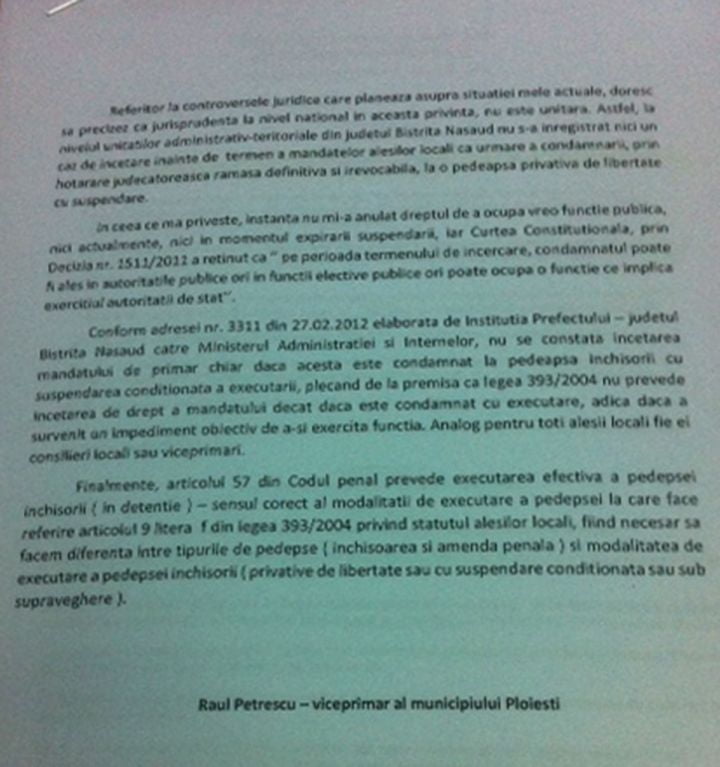 Viceprimarul Ploieștiului, Raul Petrescu, condamnat la șase luni de închisoare cu suspendare, le-a transmis consilierilor o scrisoare prin care a încercat să le explice situația sa juridică.