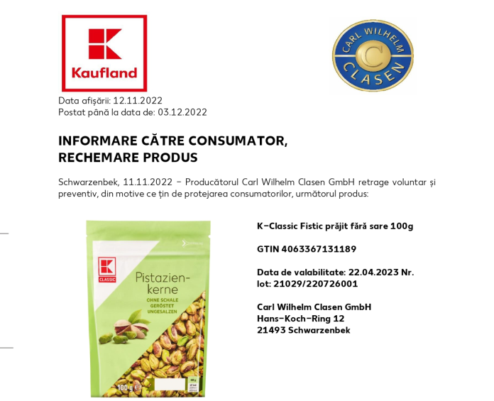 preventiv, din motive ce țin de protejarea consumatorilor, produsul „K-Classic Fistic prăjit fără sare 100g”, cu termenul de valabilitate 23.04.2023, deoarece are un conținut ridicat de Ocratoxina A.