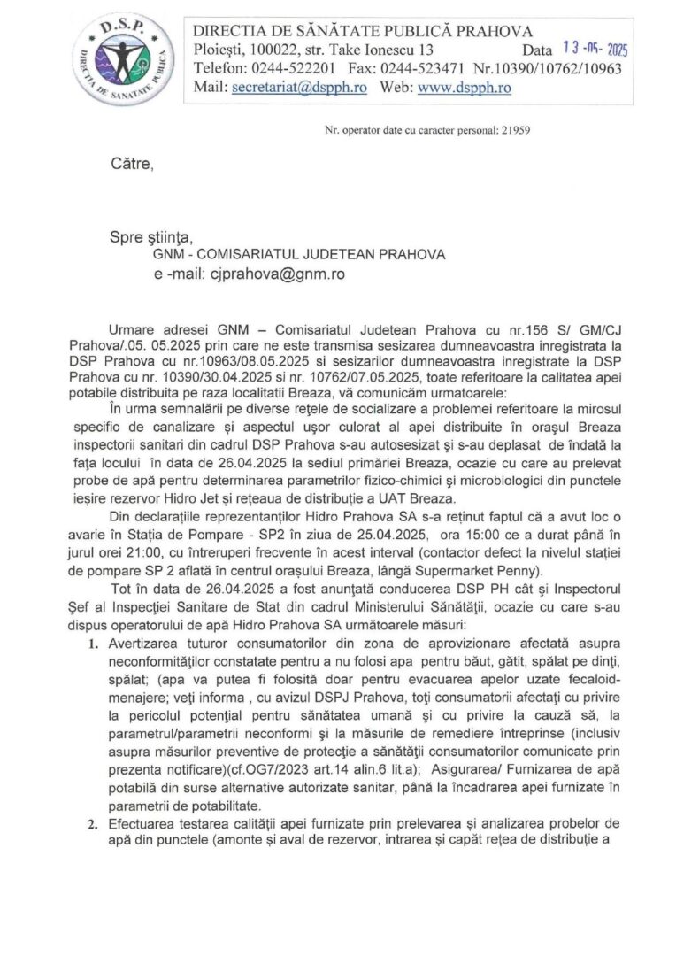 Aseară, un locuitor din Breaza ne-a transmis un răspuns primit de la DSP Prahova din care reies câteva informații importante.