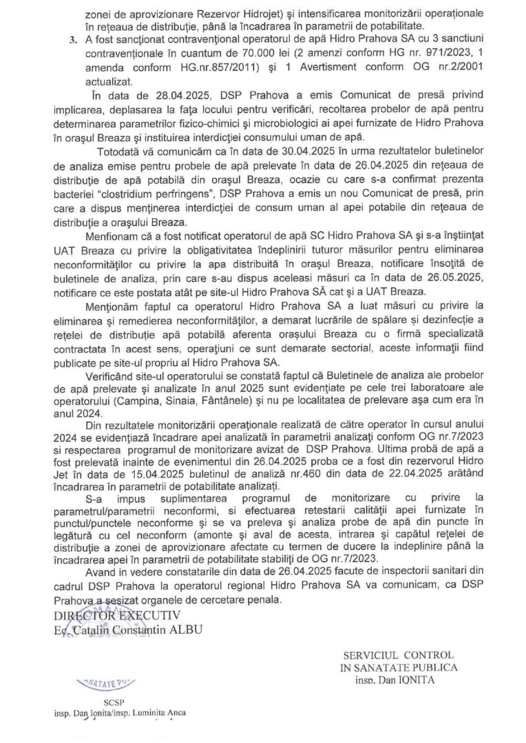 De asemenea, operatorul Hidro Prahova a fost sanctionat cu trei amenzi în valoare totală de 70.000 de lei, după ce și ANPC aplicase o amendă de 20.000 de lei (detalii AICI).