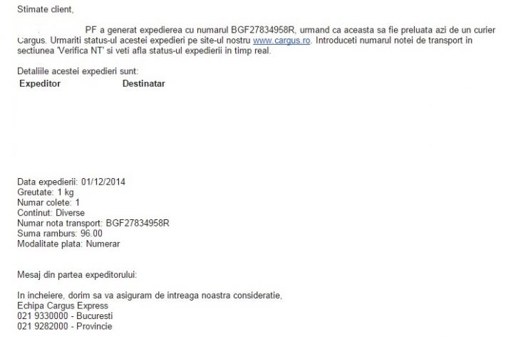 ”Va scriu pentru a va povesti ce am patit cand am apelat la firma de curierat Cargus. In data de 1 dec. 2014 mi-am facut cumparaturi online de la un magazin din Buzau. Totul a fost ok, am fost contactat de cei de la magazin ca s-a inregistrat comanda si ca urmeaza sa fiu contactat de cei de la Cargus care se ocupa cu transportul produselor. Primesc mail de la acestia ca produsul a sosit la sediul lor din Buzau si ca urmeaza a fi expediat in Ploiesti a doua zi. Dupa cum se lauda acestia pe site-ul lor – "Iti livram pachetul a doua zi chiar daca facem turul Romaniei" au trecut 3 zile de atunci si eu tot nu am primit pachetul. Sun la ei si mi se spune ca de fapt produsul meu a plecat din Buzau dar ca datorita unor erori acesta a fost trimis la Bucuresti in loc sa fie trimis la Ploiesti. Aceeasi chestie am patit-o si vara trecuta cand de asemenea am aplelat la serviciul lor pentru transportul unor documente. Raspunsul lor e intotdeauna – "Ne cerem scuze, dar avem foarte multe comenzi in perioada asta si se mai intampla sa gresim adresele." In final mi s-a spus ca nu se stie cand imi va ajunge produsul, e posibiul sa dureze si 2 saptamani deoarece trebuie sa se intoarca la ei in centru sa se faca nu stiu ce verificari. Am depus si sesizare la ANPC si va scriu si dumneavoastra in speranta ca se va rezolva problema si imi va ajunge coletul cat mai repede posibil. Va multumesc”, ne-a povestit Mihai Călin, cititorul care ne-a semnalat cazul. Observatorulph.ro a solicitat un punct de vedere oficial companiei Cargus, punct de vedere care va fi publicat în măsura în care ne va fi remis.