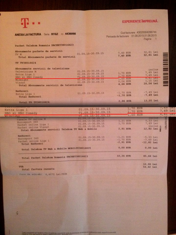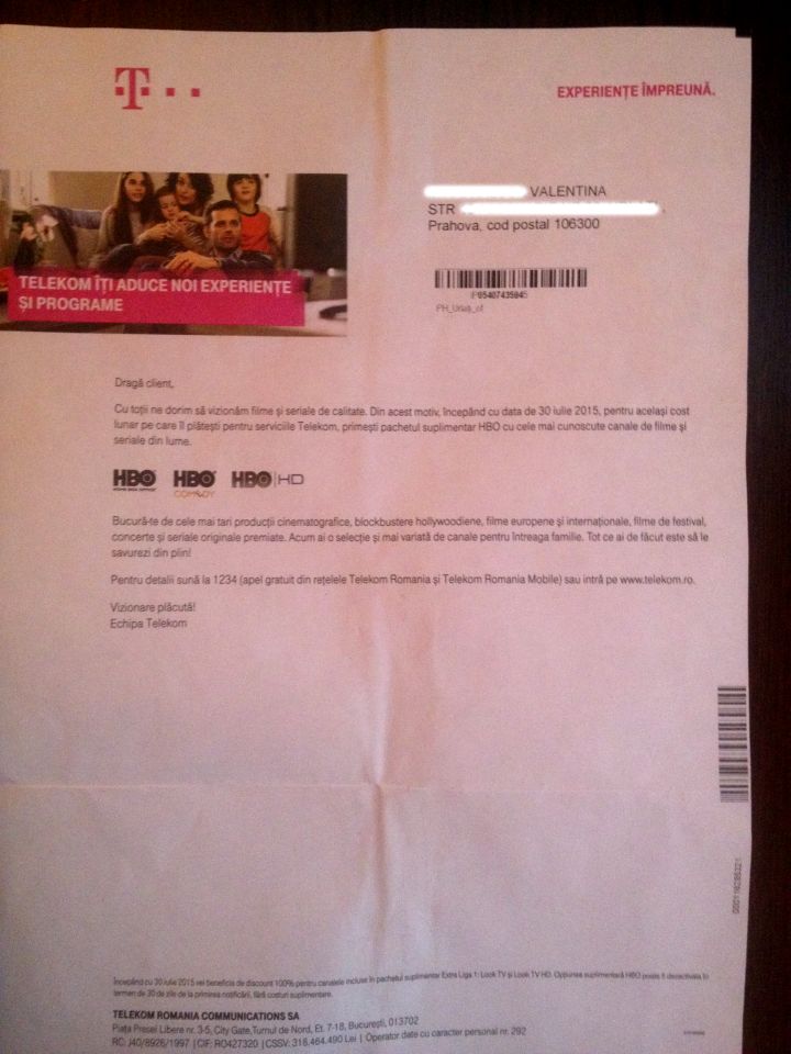 Valentina Mihai are un abonament TV la Telekom România de mai bine de un an. În luna iulie, a primit un plic din partea companiei prin care era anunțată că ”începând cu 30 iulie 2015, pentru același cost lunar pe care îl plătești pentru serviciile Telekom, primești pachetul suplimentar HBO cu cele mai cunoscute canale de filme și seriale din lume.”. Fericită de promoția Telekom, tânăra și-a activat canalele HBO. Zilele trecute, însă, când a primit factura Telekom, a avut parte de o supriză. Pachetul de canale HBO, care în scrisoarea primită în luna iulie, figura gratis, fusese introdus la un cost de 7,49 lei/lună. ”Am rămas mască! E incredibil cum își bat joc de clienți. Nu e o sumă mare, dar, așa, din bun simț…”, este de părere Valentina Mihai, cititoarea care ne-a semnalat cazul. Observatorulph.ro a solicitat un punct de vedere Telekom România pe marginea acestui subiect. Potrivit reprezentanților companiei, reducerea este aplicată, însă sub altă denumire. "Valoarea facturii a ramas aceeasi. Clienta in cauza a primit o scrisoare prin care era anuntata ca beneficiaza de pachetul suplimentar HBO pentru acelasi cost lunar pe care il achita si in trecut pentru toate serviciile Telekom. Pe factura este evidentiata separat valoarea pachetului suplimentar HBO, dar si reducerea integrala pentru un alt pachet suplimentar, Extra Liga 1, la acelasi pret. Intentia noastra a fost sa le oferim clientilor beneficii suplimentare la acelasi nivel tarifar, de aceea clientei in cauza i-a fost oferit pachetul HBO. Clienta poate renunta la pachetul suplimentar HBO, sunand la 1234", ne-au declarat reprezentanții Telekom România.