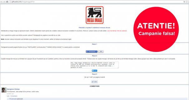 Mega Image, cunoscutul lanț de magazine, este victima unei campanii de phishing pe reţeaua de socializare Facebook. „Atenție, o campanie de phishing în care este implicat cunoscutul lanț de magazine Mega Image circulă pe Facebook! Aparent, pagina nu are niciun scop malițios, dar fiți atenți la linkurile din pagină, acestea vad pot redirecționa către site-uri infectate!”, scriu cei de la Bitfdefender.