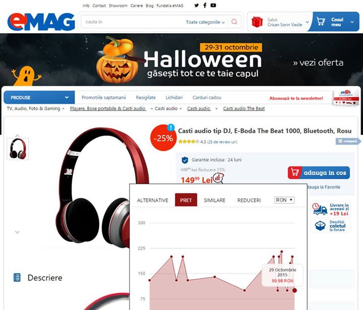 Am vazut pe Facebook o poza despre marile reduceri de la eMag. Sorin Crisan a gasit o pereche de casti care erau mai ieftine inainte de super oferta de Halloween. M-a facut curios chestia asta si am cautat pe net un plugin care sa afiseze evolutia preturilor la eMag. Dupa ce il instalezi, alegerea unui produs devine muuult mai usoara.