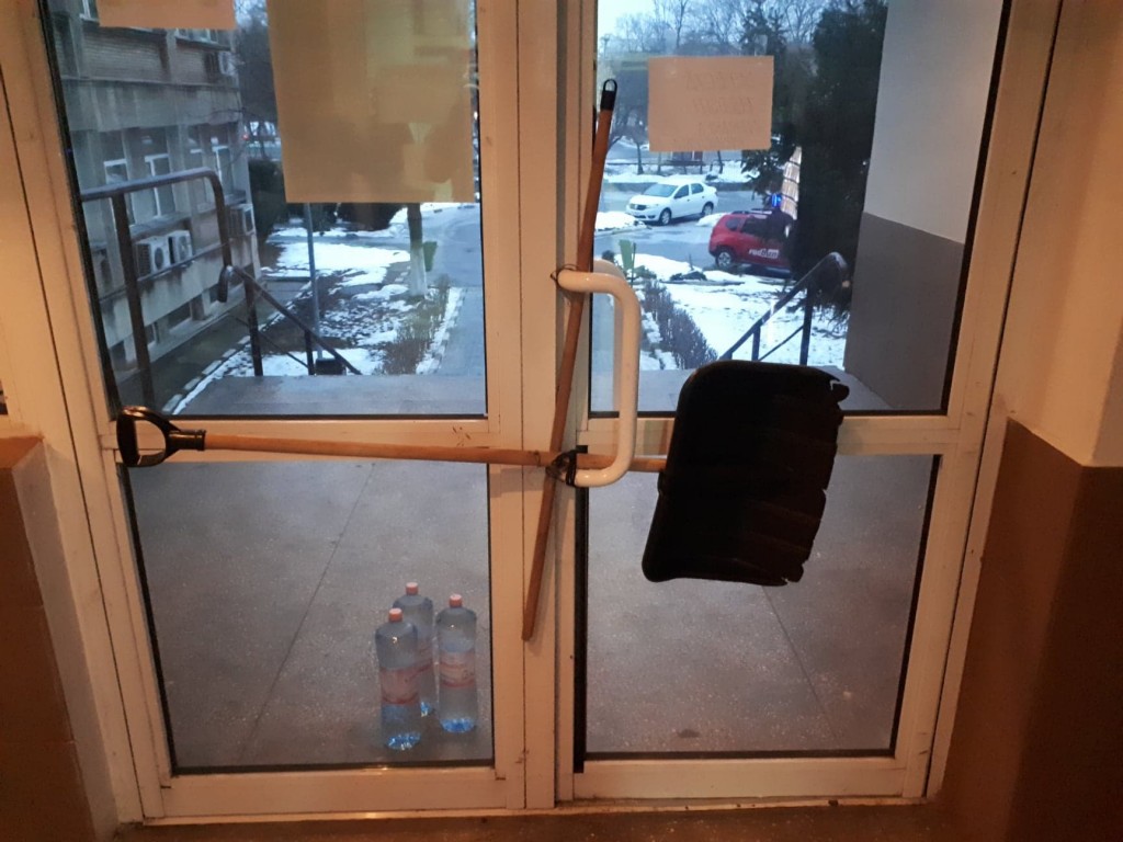 Este vorba de o ușă de acces din corpul E, care este ”asigurată” împotriva hoților cu ajutorul unor cozi de mop și de lopată de zăpadă.