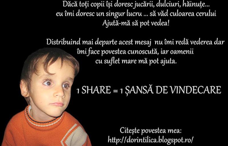Familia lui Dorin Țilică nu își permite, financiar vorbind, să strângă cei 30.000 de dolari necesari pentru a achita intervenția chirurgicală de care are nevoie copilașul pentru a vedea. Dorin are patru anișori și nu a văzut niciodată, pentru că suferă de „retinopatia prematurităţii” adică, dezlipire totală de retină. Copilul a fost diagnosticat cu această boală pe când avea deja şase luni. Singura soluţie este o intervenţie chirurgicală care se face în Statele Unite ale Americii, în Detroit, la clinica Williams Beaumont. Părinții lui Dorin au nevoie de 30.000 de dolari. Au mare nevoie de ajutor! Vă rugăm să îi ajutați! Este mare păcat că acest copil nu are nicio șansă să vadă din cauza lipsei de mâncare.