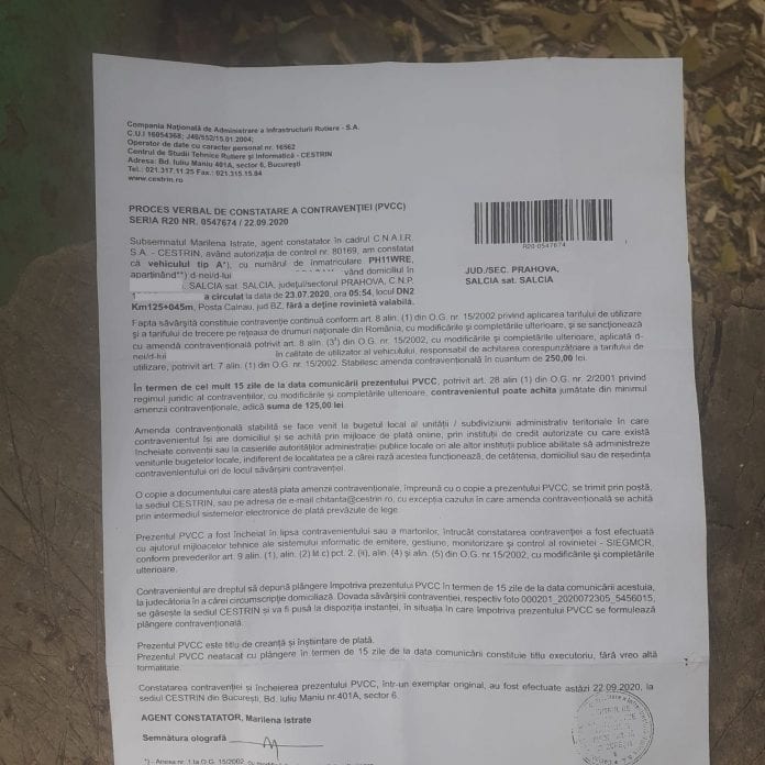 În fapt, bărbatul, care se află acum în Spania, are de plătit 250 de lei pentru că mașina vândută mai demult a circulat pe DN 2, în Buzău, fără rovinietă.