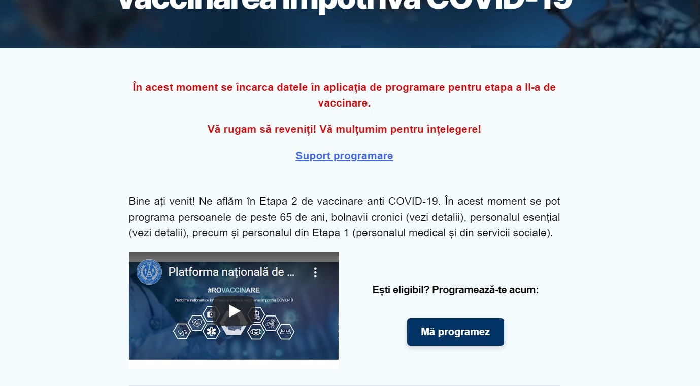 Deși autoritățile au anunțat că vineri, 15 ianuarie, de la ora 15:00, începe etapa a doua de vaccinare anti-covid a populației, site-ul nu a permis decât programarea personalului medical. Ulterior a fost afișat mesajul ”Vă rugăm să reveniți!”