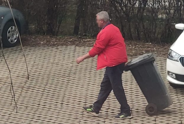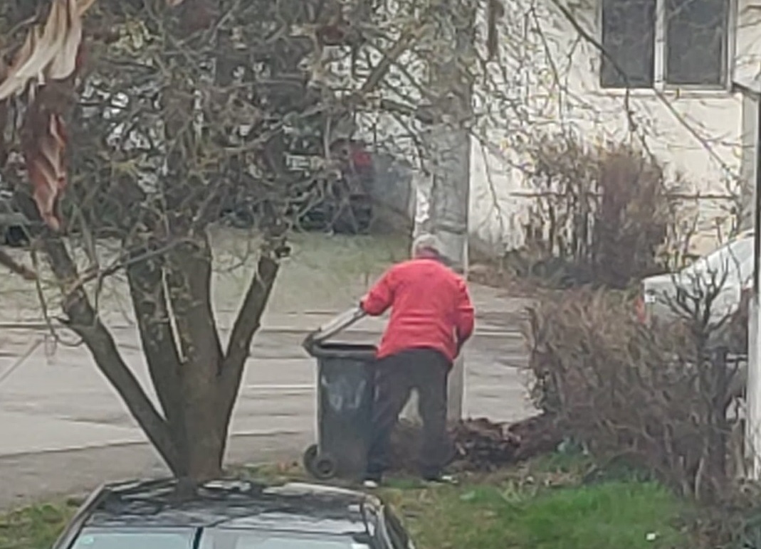 Mai întâi a dus punga cu gunoi pe urmă a adus mai multe gunoaie amestecate cu frunze.