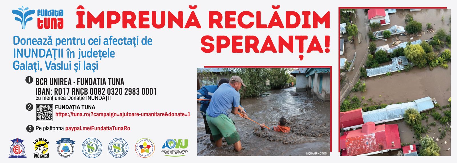 ”Contăm pe implicarea dumneavoastră și vă invităm să vă alăturați misiunii noastre de a RECLĂDI SPERANȚA. Aceste inundații au devastat comunități, distrugând case, drumuri și munca de-o viață a oamenilor. Fiecare donație, indiferent de sumă, va contribui la aducerea zâmbetului pe fețele celor aflați în nevoie și la crearea unui mediu mai cald și mai solidar în comunitatea noastră” este mesajul reprezentanților Școlii Spectrum din Ploiești, care organizează această campanie umanitară împreună cu Fundația Tuna.