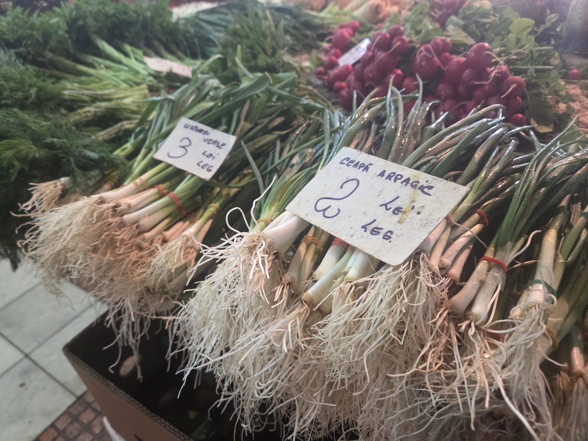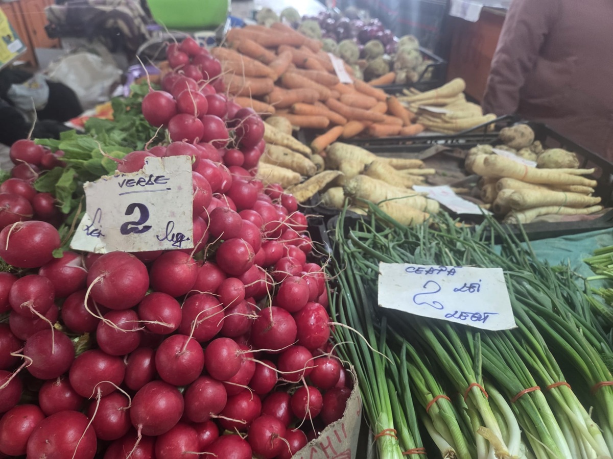 La piața de la Halele Centrale din Ploiești este forfotă. Tarabele sunt încărcate cu ceapă verde, usturoi verde, salată și spanac.