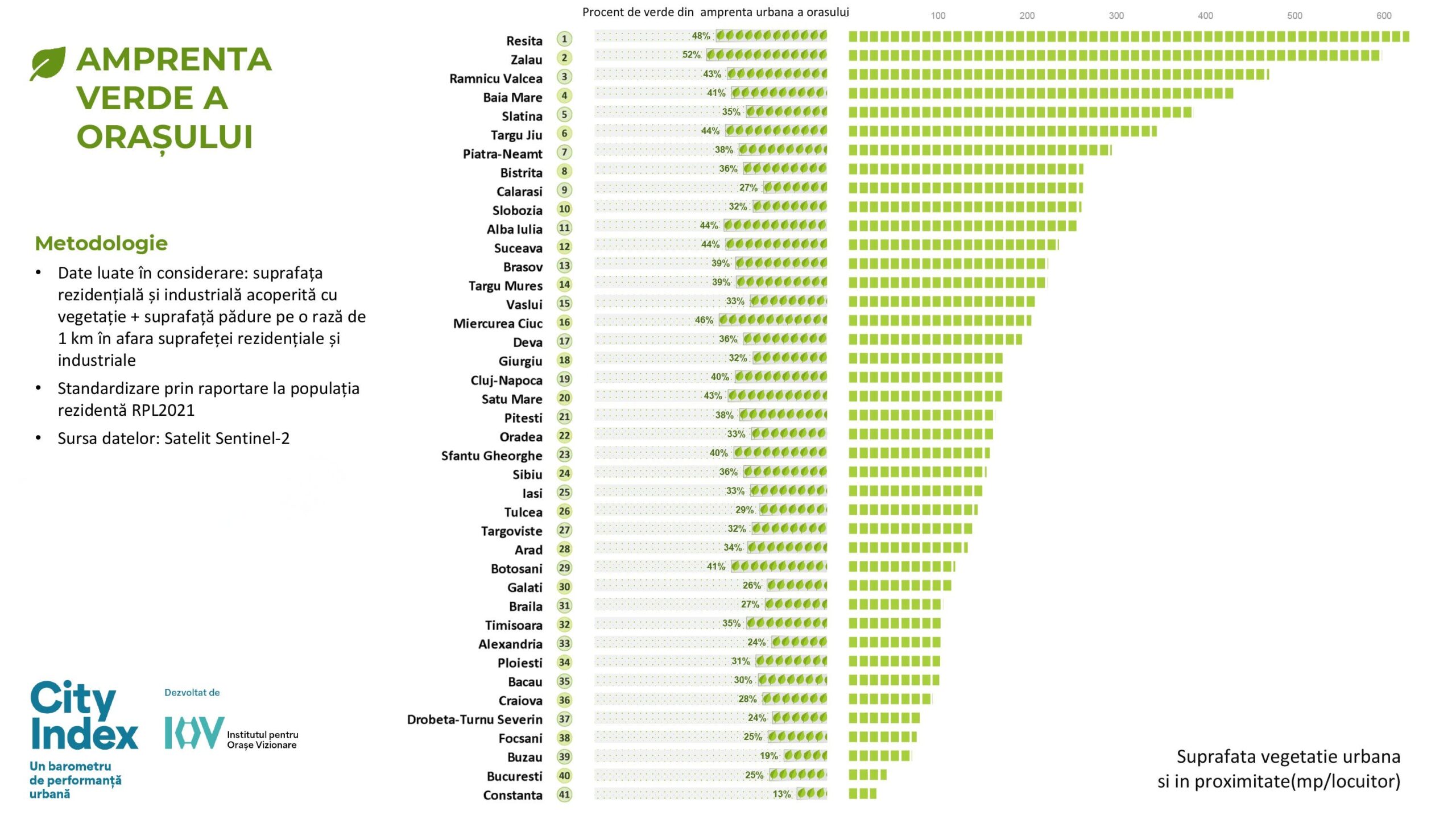 Pentru a măsura ”verdele”, Institutul pentru Orașe Vizionare a dezvoltat un indicator propriu, în care a analizat suprafața acoperită cu vegetație și pădure pe o rază de 1 kilometru în afara suprafeței rezidențiale și industriale, raportată la populația rezidentă, potrivit Recensământului Populației și Locuințelor 2021.