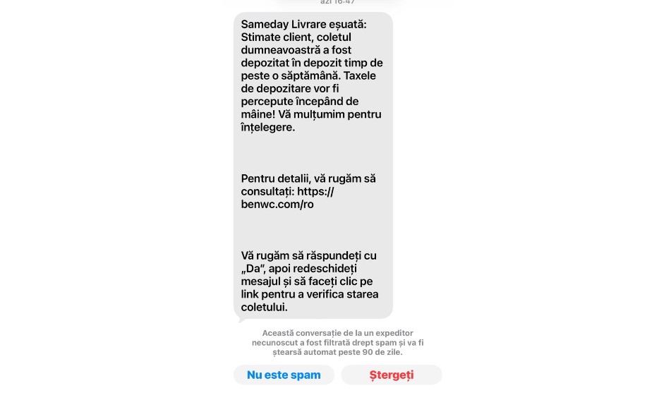 „Sameday – Livrare eșuată: Stimate client, coletul dumneavoastră a fost depozitat în depozit timp de peste o săptămână. Taxele de depozitare vor fi percepute începând de mâine! Vă mulțumim pentru înțelegere.