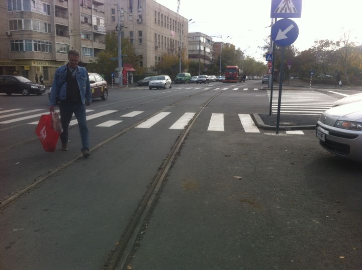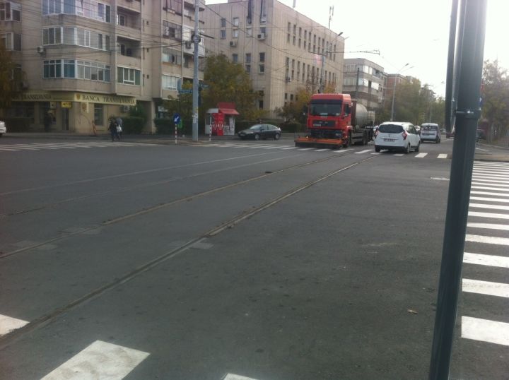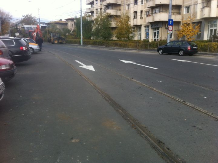 Muncitorii scot bitumul de pe traseul căii de rulare a tramvaiului. Intersecţiile au fost marcate şi au fost montate indicatoare rutiere noi.