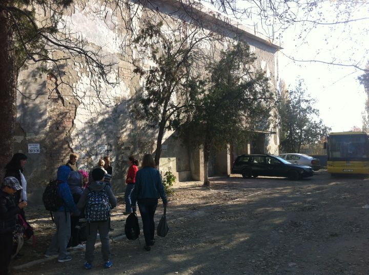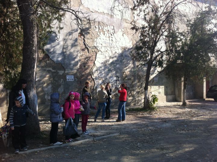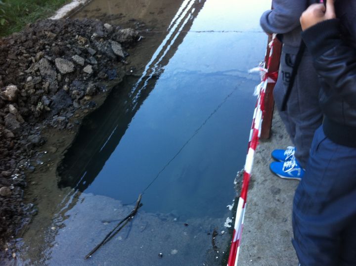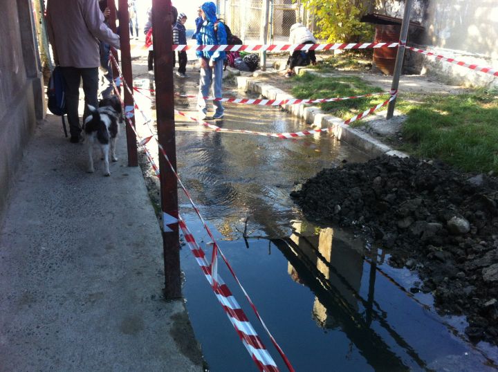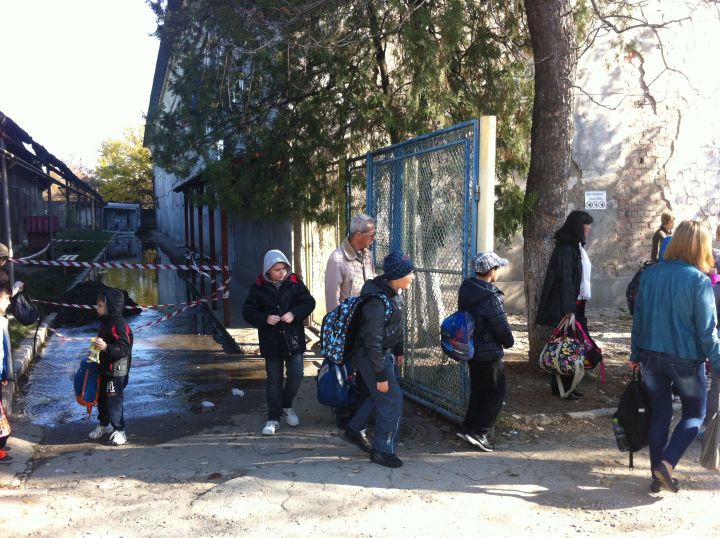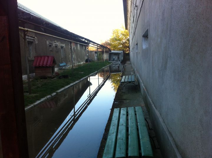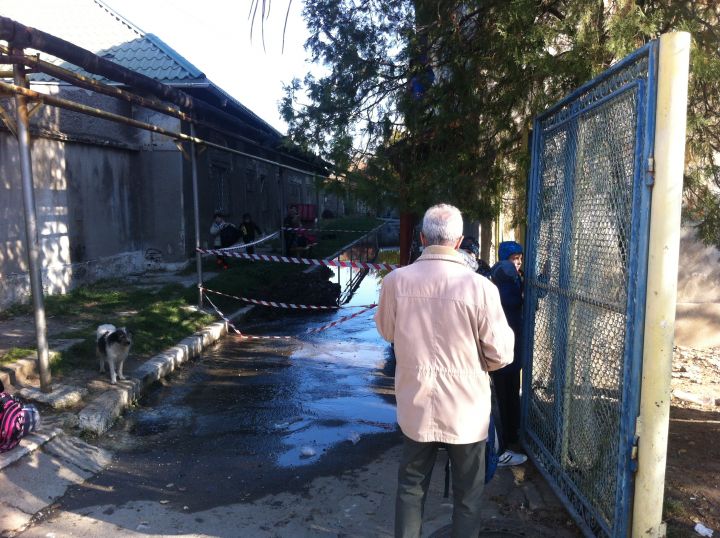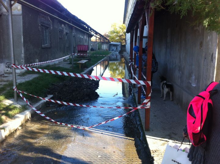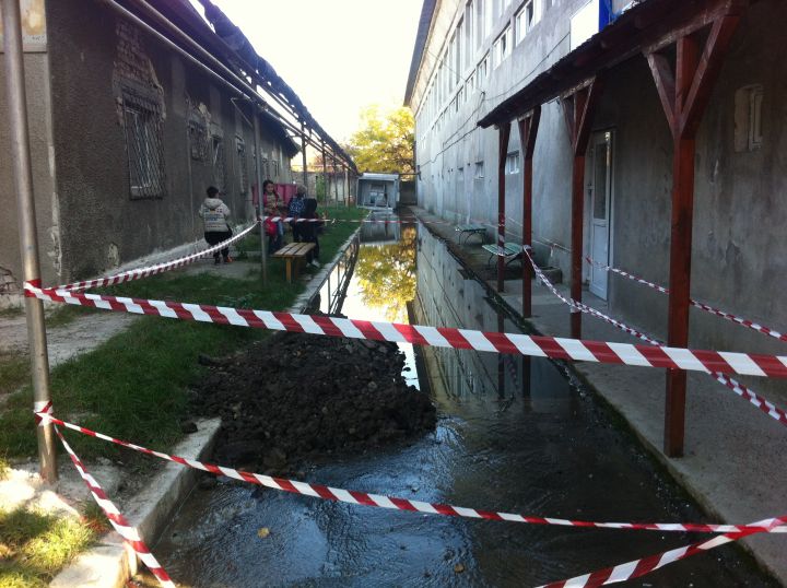 Intrarea în clădire este inundată din cauza unei conducte sparte, iar părinții care își duc copiii la cursurile de înot sunt nevoiți să meargă lipiți de clădirea care este și așa semnalizată ca având un potențial risc.