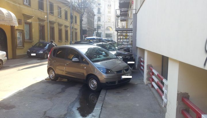 Un alt sofer a parcat pe coltul intersectiei, fara sa ii pese ca cel care iese de pe straduta nu are vizibilitate si trebuie sa ajunga aproape pe contrasens ca sa se asigure.