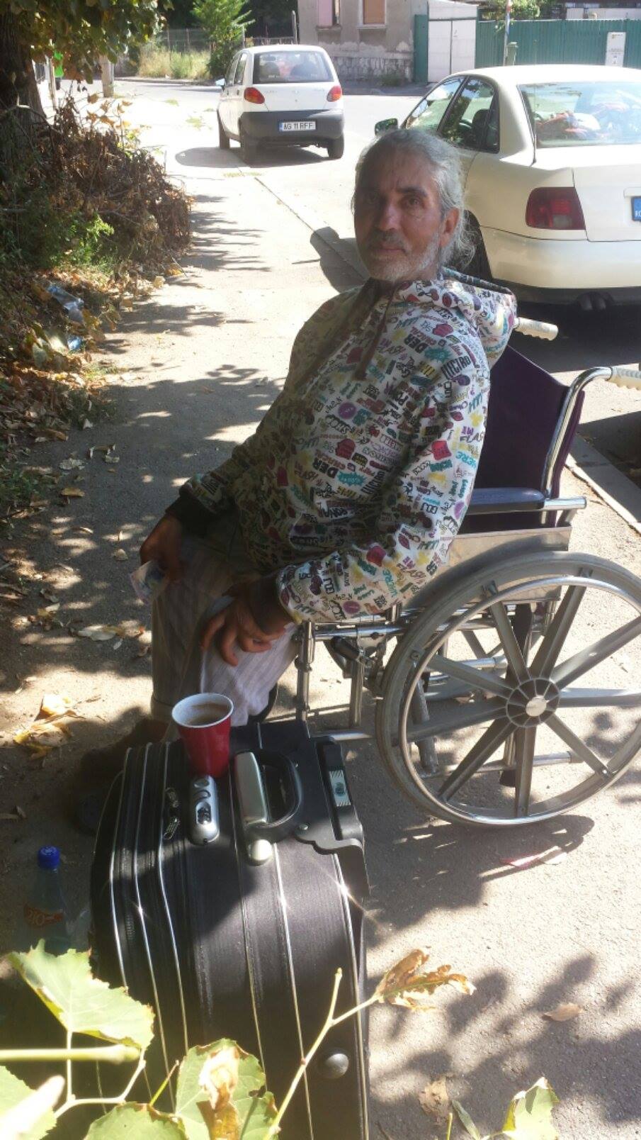 Un cititor ne-a trimis pe adresa redacției o poză recentă cu fostul pacient, însoțită de mesajul: De vreo 2 săptămâni,de câte ori am trecut prin dreptul fostei maternități,am văzut o persoana în cărucior cu rotile,în pijama și cu o valiză lângă el. La început am crezut ca este vreun pacient și n-am dat importanță,dar,trecând în fiecare zi ,l-am găsit în același loc. Am intrat în vorbă cu el (nefiind prea comunicativ)am aflat ca a fost internat în spital pt o perioadă,și acum a fost externat, si neavând casă,stă de vreo 2 săptămâni între copacii din fața spitalului. V-am scris în speranța ca îl puteți ajuta ,mediatizandu-i cazul. Are picioarele foarte umflate,asta fiind și motivul pt. care a fost internat inițial în spital.