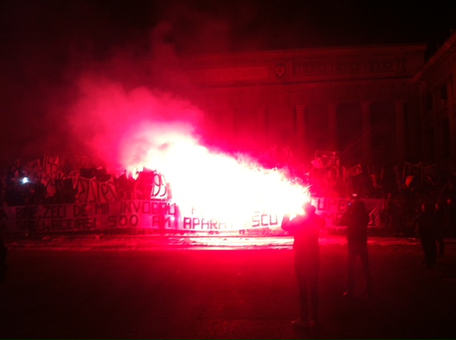 Mitingul se desfășoară pe scările de la Palatul Culturii iar suporterii sunt supravegheați poliție, poliție locală și jandarmeri. Pentru că au fost folosite și artificii și petarde, la fața locului a ajuns și o autospecială de la ISU Prahova.