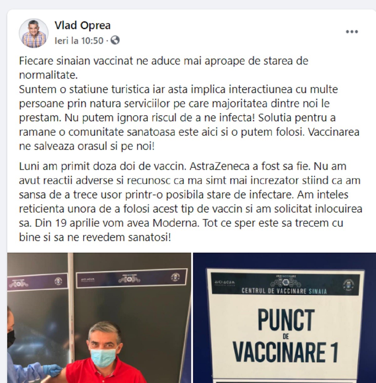 „Fiecare sinăian vaccinat ne aduce mai aproape de starea de normalitate. Suntem o stațiune turistică, iar asta implica interacțiunea cu multe persoane prin natura serviciilor pe care majoritatea dintre noi le prestăm. Nu putem ignora riscul de a ne infecta! Soluția pentru a rămâne o comunitate sănătoasă este aici și o putem folosi. Vaccinarea ne salvează orașul și pe noi! Luni am primit doza doi de vaccin. AstraZeneca a fost să fie. Nu am avut reacții adverse și recunosc că mă simt mai încrezător știind că am șansa de a trece ușor printr-o posibilă stare de infectare. Am înțeles reticența unora de a folosi acest tip de vaccin si am solicitat înlocuirea sa. Din 19 aprilie vom avea Moderna. Tot ce sper este să trecem cu bine și să ne revedem sănătoși!”, a precizat Vlad Oprea, primarul orașului Sinaia.