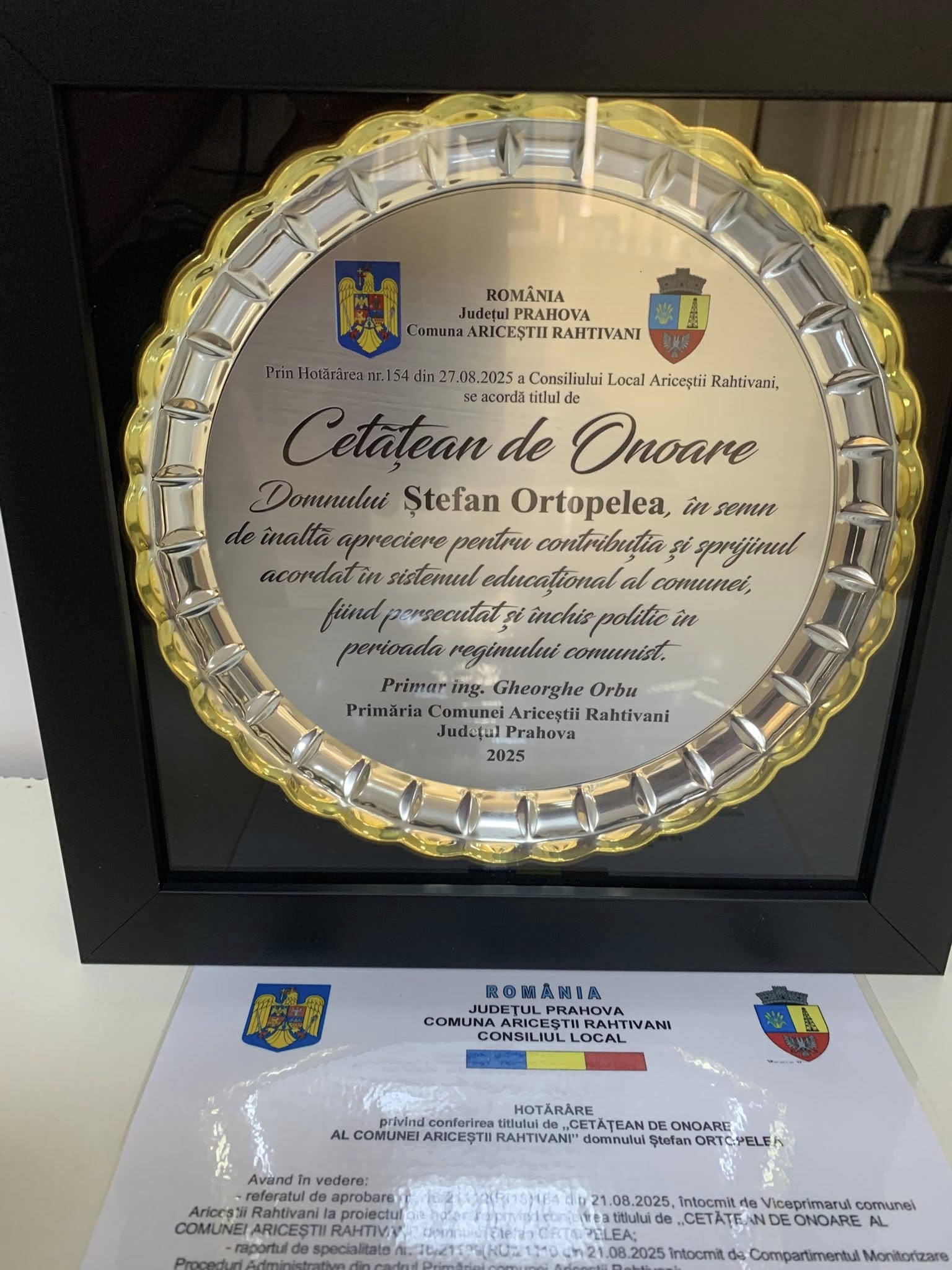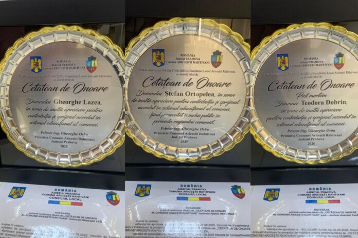 Astfel, în urma hotărârii nr. 157 din 27.08.2025, votată în ședințele anterioare ale Consiliului Local, domnul primar George Orbu a numit ca Cetățeni de Onoare pe doamna Teodora Dobrin (post-mortem) pentru contribuția și sprijinul acordat în sistemul educațional al comunei, al carui premiu a fost primit de fiica acesteia, pe domnul profesor de istorie, Ștefan Ortopelea pentru contribuția și sprijinul acordat în sistemul educațional al comunei, fiind persecutat și închis politic în perioada regimului comunist și pe domnul Lazea Gheorghe, profesor de matematică și director al Școlii din Ariceștii Rahtivani, pentru contribuția și sprijinul acordat în sistemul educațional al comunei.