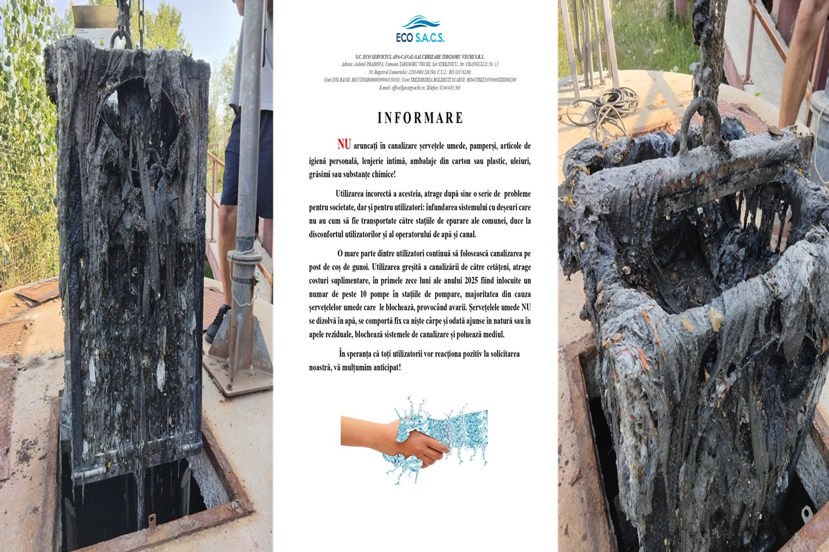 Societatea ECO Servicii Apă-Canal-Salubrizare Târgșoru Vechi (ECO S.A.C.S.) a transmis o informare către locuitorii comunei, prin care atrage atenția asupra problemelor cauzate de aruncarea necorespunzătoare a unor deșeuri în sistemul de canalizare.