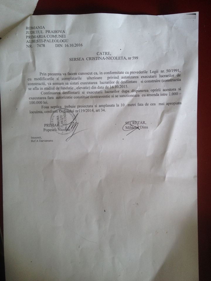 Totul a început în urmă cu câteva luni, când Bogdan Stanciu a demarat lucrările de construcție a locuinței sale din comuna Albești Paleologu. ”Nu am avut și nu am o problemă cu el. Când am văzut, însă, că a excavat și și-a betonat fosa fix lângă gardul casei tatălui meu, am luat foc. E o distanță de circa un metru între perete fosei și peretele magaziei legate de casa tatălui meu. Am stat de vorbă omenește cu el. I-am explicat că, potrivit legii, trebuie să-și construiască fosa la cel puțin 10 metri de prima locuință. A zis că pe terenul lui face ce vrea”, povestește Georgeta Dinulescu, femeia care ne-a semnalat cazul. Aceasta a făcut o sesizare la Primăria din Albești Paleologu, însă, susține ea, demersurile administrației publice s-au rezumat doar la emiterea unei somații către vecinul său. ”Am făcut sesizare, am primit răspuns. Au trimis și vecinului o somație, dar doar atât. Nimic mai mult. Acum, voi seziza și SANEPID-ul pentru că nu este normal așa ceva. Nu vreau nimic altceva decât să-și mute fosa la distanța din lege”, ne-a declarat Georgeta Dinulescu.