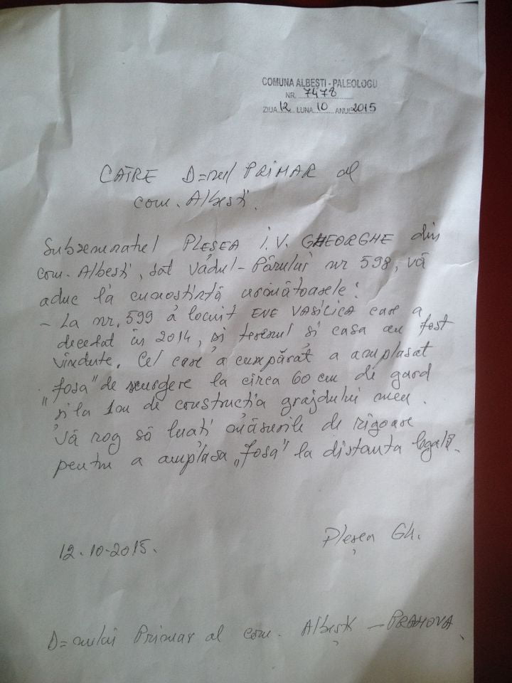 O femeie din Ploiești susține că, de câteva luni, tatăl său trăiește un adevărat calvar în locuința din Albești Paleologu, unde stă de o viață. Un vecin și-a construit o fosă septică fix lângă gardul locuinței sale. De partea cealaltă, acesta se apără și susține că arhitectul i-a dat decis amplasamentul fosei, având ca bază legislația în vigoare.