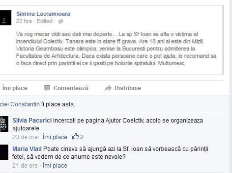 Colegii dar și profesorii tinerei sunt alături de aceasta. „A fost o elevă etalon a liceului nostru. A dat anul acesta Bacalaureatul și mi-a spus că vrea să urmeze Facultatea de Arhitectură. A fost o elevă olimpică. A participat la mai multe olimpiade, la Română, la Matematică, la informatică, pentru că specializarea în care a urmat cursurile a fost secția Real. A fiost creierul grupului care a participat la concursul The Best. Am numai cuvinte de laudă pentru această fostă elevă a mea. Ne rugăm, și noi profesorii, dar și foștii colegi, pentru sănătatea Victoriei. În centrul orașului lumea aprinde și se roagă pentru Victoria, dar și pentru celelalte victime ale incendiului”, a declarat pentru observatorulph.ro fostul diriginte al Victoriei Geambașu, profesor Constantin Istrate, profesor de Geografie la Liceul Teoretic George Tocilescu. Pe o rețea de socializare circulă un mesaj prin care lumea este rugată să sprijine părinții care se află la Spitalul Sf. Ioan din Capitală, alături de fata lor care a fost victimă a incendiului din Clubul Colectiv. din București.